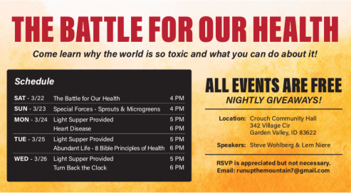 The Battle for our Health. Free Community event in Garden Valley Idaho, presented by Lem Niere on March 26, 2025